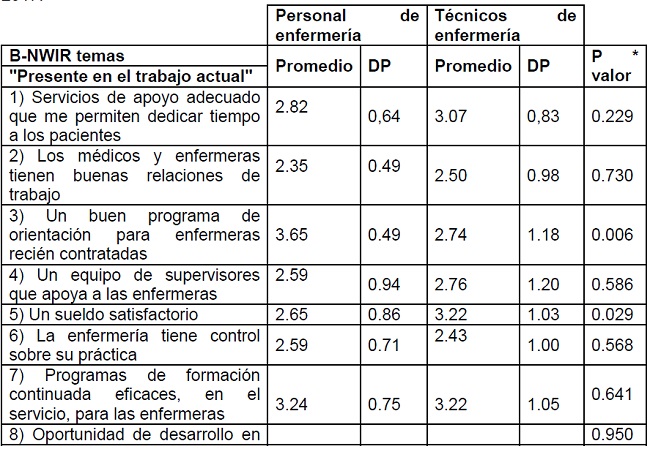 En lo que se refiere a la variación de los valores de las medias, que determinan la homogeneidad de las respuestas proporcionadas por los participantes, por medio de la Desviación estándar (DP), los resultados apuntan a una mayor dispersión de respuestas entre técnicos de enfermería. En el caso de los enfermeros y técnicos de enfermería obtuvieron una marcada divergencia, a saber: "Oportunidades de perfeccionamiento" (Enfermeros = 0,49; Técnicos de Enfermería = 0,97); "Trabajo con enfermeros que son clínicamente competentes" (Enfermeros = 0,00; Técnicos de Enfermería = 0,99); "Un programa de tutoría para recién contratados" (Enfermeros = 0,47; Técnicos de Enfermería = 1,05); "Los enfermeros que trabajan regularmente y permanentemente juntos nunca tienen que cubrir otra unidad" (Enfermeros = 0,51, Técnicos de Enfermería = 0,90) y "Desplazamiento de personal para equilibrar los equipos entre unidades" (Enfermeros = 0,59; Técnicos de Enfermería = 1,15).