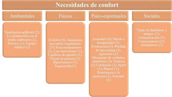 En el análisis de contenido, se identificaron 28 unidades de registro en el marco de las necesidades de confort. La unidad de registro se traduce en necesidades de cuidados concretos. Cada subcategoría del análisis de contenido representa el contexto del que emergen las necesidades, por lo que el 28% de las necesidades emergen del contexto físico, el 14% del medio ambiente y el 14% del social, mientras que el 56% de las necesidades identificadas se derivan del contexto psico-espiritual.