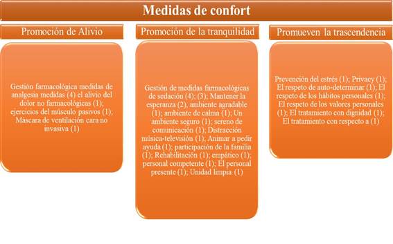 De los artículos en estudio, las medidas de confort promotoras de la tranquilidad fueron las más implementadas. En la categoría de las medidas de confort se identificaron 27 unidades de registro, que representan las intervenciones de enfermería. De la totalidad de las medidas de confort, el 18% promueve el alivio, el 56% la tranquilidad y el 26% la trascendencia.