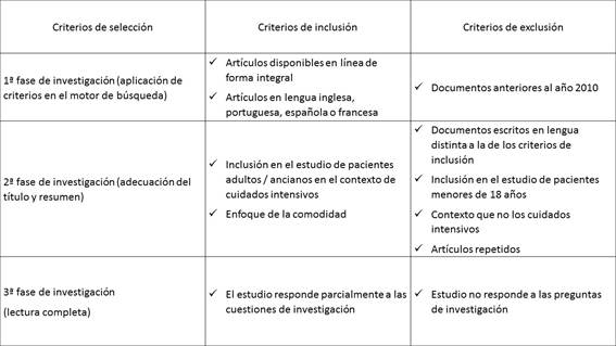 Con el fin de utilizar una terminología única en la investigación de la literatura fueron consultados los descriptores en lengua portuguesa en el DeCS 16, y después de su traducción al inglés fueron sondados en el MeSH 17. Los descriptores adoptados para la investigación de este estudio son: patient, comfort, well-being, critical care, intensive care, nursing, nursing care, critical care nursing, intensive care nursing.