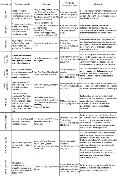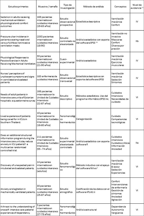 Otra lectura posible a realizar de esta revisión integrativa se refiere a la temática abordada por parte de los estudios primarios, el confort del paciente sometido a ventilación mecánica. Las necesidades de confort derivadas de la utilización de la ventilación artificial, la ansiedad, la agitación y el estrés respiratorio y la utilización de medidas de confort, como la gestión de las medidas farmacológicas de sedación, las enseñanzas al paciente, entre otras, se mantienen en concordancia.