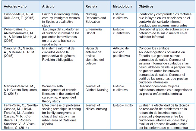 Se incluyeron todos aquellos artículos (originales, de revisión, breves y de reflexión) publicados en castellano o en inglés en revistas de enfermería sobre el cuidado informal y los cuidadores informales de personas mayores en situación de dependencia funcional en un entorno domiciliario en el Estado español.