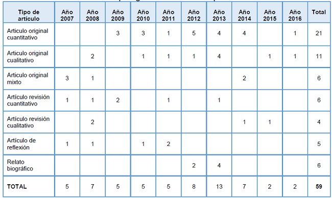 El número de publicaciones relacionadas con el tema de investigación se mantuvo estable durante el período de análisis, con un ligero aumento durante los años 2012 y 2013, disminuyendo de forma significativa en los años 2015 y 2016. Se observa que el tipo de artículo más publicado entre 2007 y 2016 fue el basado en un estudio original cuantitativo, con un total de 21 artículos editados, seguido del artículo original basado en un estudio cualitativo, con un total de 11. La tipología de artículo menos recurrente fue la de artículo de revisión cualitativa, con 4 artículos.