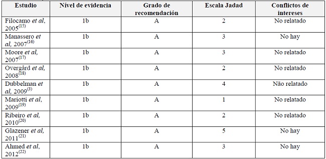 El cuarto cuadro se refiere a análisis de la calidad de los estudios que fueron clasificados en cuanto al nivel de la evidencia, grado de recomendación, puntuación por la escala de Jadad y conflicto de intereses