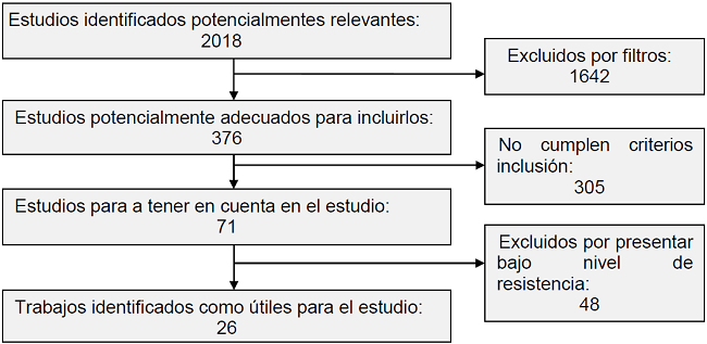 Results: After the bibliographic research, 2018 articles were identified, out of which 71 articles were obtained after applying filters and inclusion criteria. Finally, 26 articles were selected.