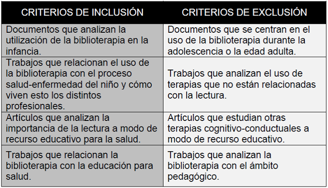 Además se han definido varios criterios de inclusión y exclusión (véase tabla 1).