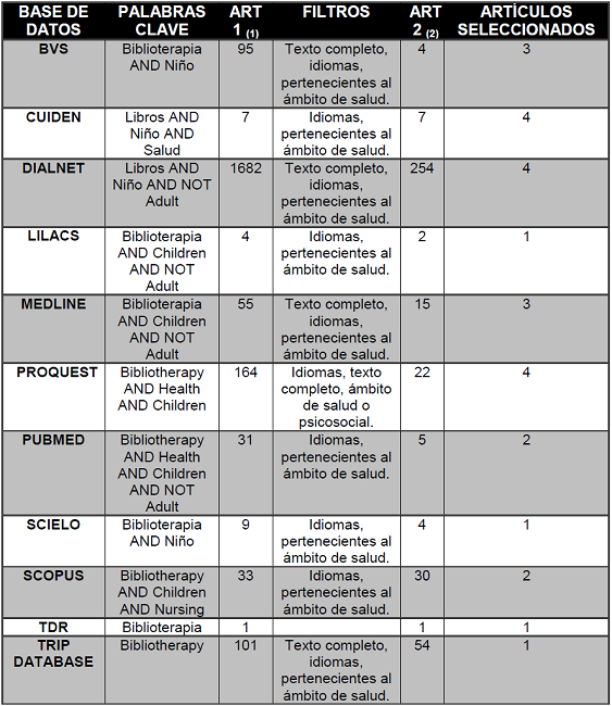 Conclusiones: La biblioterapia resulta beneficiosa en diversos ámbitos relacionados con el proceso salud-enfermedad durante la infancia, mejorando entre otras cosas la autoestima y la aceptación de la realidad, promoviendo el bienestar psicológico y sirviendo de puente en la comunicación entre el individuo y el profesional de la salud.