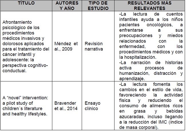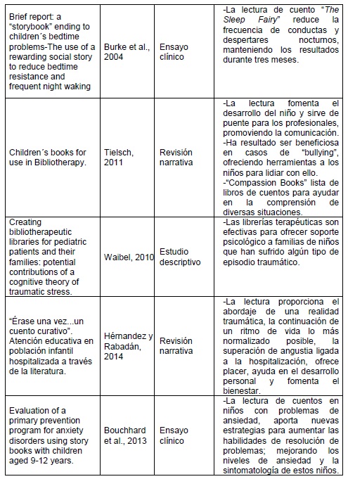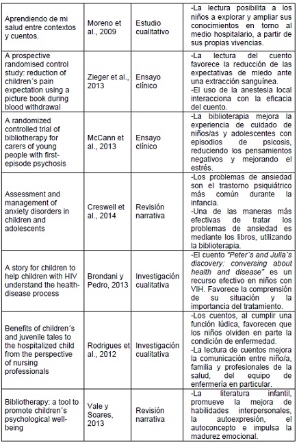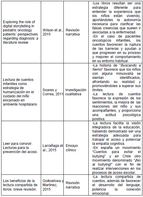 Conclusions: Bibliotherapy is beneficial in various areas related to the health-disease process during childhood, improving among other things self-esteem and acceptance of reality, promoting psychological well-being and serving as a bridge in communication between the individual and the health professional.