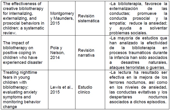 Diversos estudios han demostrado la utilidad de la lectura en el desarrollo personal de los niños (ver tabla 3). Se diferencian distintos tipos de biblioterapia: la clínica (dirigida a enfermos y puesta en marcha por facultativos y bibliotecarios) y la evolutiva (bibliotecas escolares o públicas que promueven el autoconocimiento en diferentes etapas del desarrollo de la persona)5.