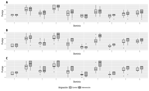 Gráfico de caja y bigotes de la distribución de puntajes por dominios de la escala de adherencia entre pacientes con seguimiento telefónico y controles. A. Antes de la intervención B. Doce meses de seguimiento. C. Seis meses posteriores al seguimiento. Dominio 1: confianza en el profesional (rango:2-8); dominio 2: conocimiento del tratamiento farmacológico (rango:4-16); dominio 3: accesibilidad a los servicios de salud (rango: 3-12); dominio 4: acepta el diagnóstico (4-16); dominio 5: reconoce signos de alarma (3-12); dominio 6: busca refuerzo externo para cumplir sus comportamientos (2-8); dominio 7: mantiene su peso en el rango adecuado (4-6); dominio 8: conoce la dieta recomendada (4-8); dominio 9: realiza actividad física (3-12); dominio10: estado de ánimo (3-12).