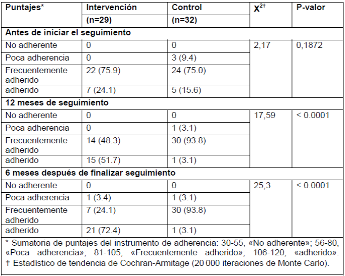 En la Tabla 2, se puede observar que los pacientes del grupo control permanecen en el nivel «frecuentemente adherido» a los 12 meses de seguimiento y 6 meses después de terminarlo. Por el contrario, en el grupo de intervención se evidencia un incremento en la clasificación de pacientes en el nivel «adheridos», 6 meses después de terminada la intervención (p < 0.0001).
