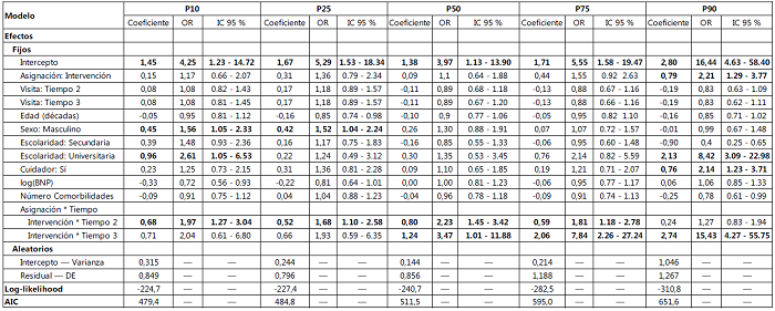 Para mejorar el poder estadístico, se realizó un modelo logístico mixto de cuantiles para niveles de adherencia al tratamiento en función de la asignación (intervención) y otras variables explicativas (edad, género, escolaridad, cuidador, comorbilidades, BNP, tiempo). Ver Tabla 3.