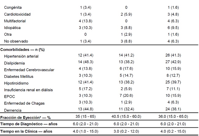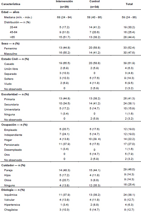 Dentro de las variables sociodemográficas, se destaca que la edad que predominó en el grupo control e intervención fueron mayores de 65 años, casados y de escolaridad primaria, seguido de secundaria y universitaria. Con relación al sexo en el grupo intervención hubo un poco más de hombres a diferencia del grupo control. Frente a la ocupación en el grupo intervención, la mayoría eran pensionados y en el grupo control se dedicaban al hogar. En el grupo intervención, la mayoría de los participantes tenían cuidador, a diferencia del grupo control. Las variables clínicas que más predominaron en el grupo control e intervención fueron la etiología isquémica, clase funcional II, comorbilidades como la hipertensión arterial, dislipidemia, demencia e hipotiroidismo. La fracción de eyección estuvo entre 35 y 40 %, y el tiempo de diagnóstico de la enfermedad fue de 6 años, con un tiempo de permanencia en la clínica de falla cardiaca entre 3 y 4 años. Se presentan las características de los dos pacientes que fallecieron en el grupo control porque alcanzaron a ser incluidos, aunque fallecieron antes de iniciar el seguimiento.