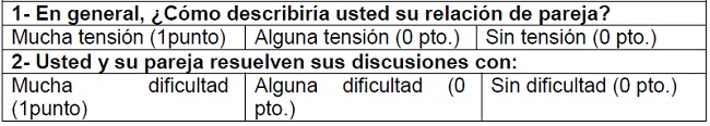Existen dos maneras de puntuar esta escala: la más aceptada según Juncal, Hernández y Ruiz 15, es dar una puntuación de 1 a las respuestas más externas de “mucha tensión” y “mucha dificultad” y 0 a las demás opciones de respuesta. Una puntuación de 1 se considera positiva en el cribado, o lo que es lo mismo, alto riesgo de VG. La fiabilidad de este cuestionario se ha considerado alta tras la validación del mismo 16. El cuestionario de esta escala se presenta en el Anexo I.