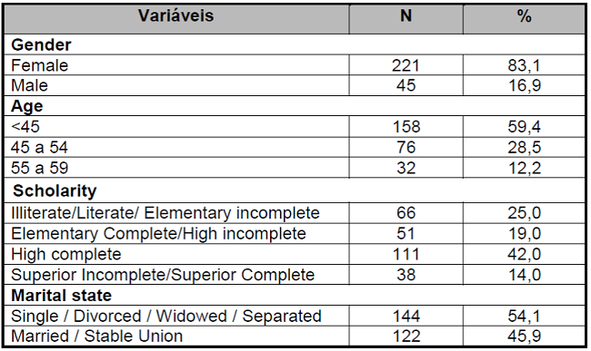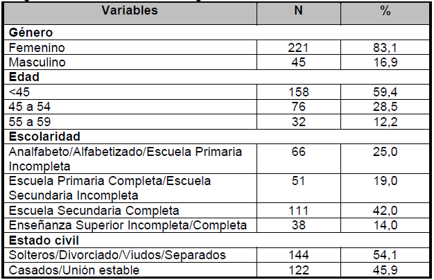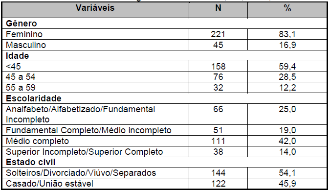 La Tabla 1 describe las características sociodemográficas de los 266 participantes en el estudio. Los datos muestran que la mayoría eran mujeres 221 (83.1%), con menos que 45 años 158 (59,4%), escuela secundaria completa 111 (42%) y solteros/divorciados/viudos/separados 144 (54,1%).