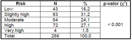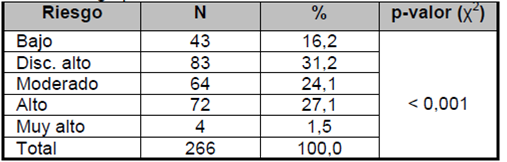 Con respecto a la estratificación de la muestra según el riesgo de desarrollar DM2, la presencia de bajo riesgo se encontró en 43 (16.2%) de los entrevistados y el riesgo muy alto en cuatro (1,5%). La mayoría de los participantes presenta riesgo discretamente alto 83 (31.2%) como muestra la Tabla 2.