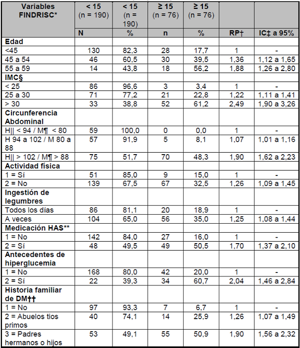 Hubo asociación estadísticamente significativa en la prevalencia de factores de riesgo: mayor edad, IMC de 25 a >30, mayor circunferencia abdominal, inactividad física, consumo no habitual de verduras y frutas, medicación para la hipertensión, antecedentes personales de hiperglucemia y historia familiar de DM2, de acuerdo con la Tabla 3.