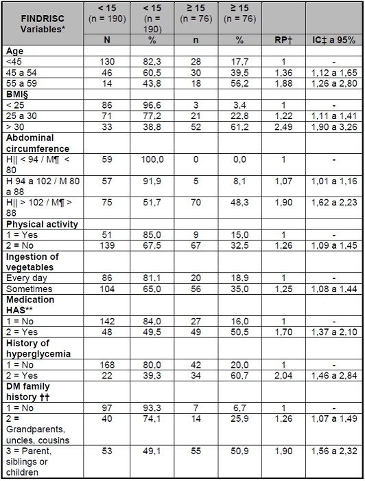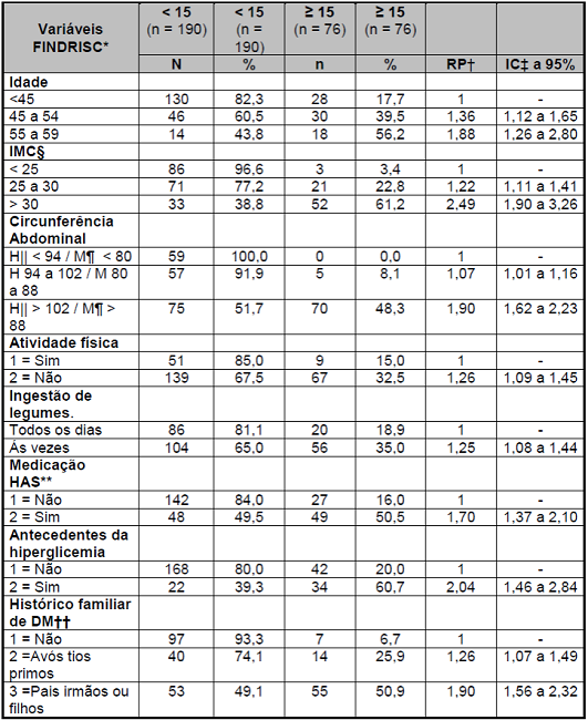En seguida, se categorizó el FINDRISC de forma dicotómica para facilitar la interpretación de los resultados en < 15 puntos y ≥ 15 puntos, de acuerdo con otros autores, que representan, respectivamente, riesgo bajo a moderado y riesgo alto a muy alto. Para una comparación de las características asociadas con ese resultado, se utilizó estadística inferencial, con cálculo de las proporciones de prevalencia cruda (RP) con intervalo de Confiança de 95% (IC)6)(10)(14.
