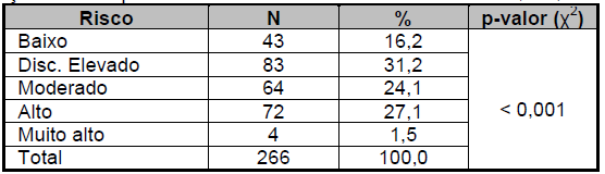 Results: Low risk was found in 43 (16.2%) of the interviewees and the very high risk found in 4 (1.5%). The majority of the participants presented a slightly elevated risk 83 (31.2%). There was a statistically significant association in the prevalence of risk factors: increased age, overweight, obesity, increased abdominal circumference, physical inactivity, unusual intake of vegetables and fruits, use of hypertension medication, personal history of hyperglycemia and family history of type diabetes mellitus 2.