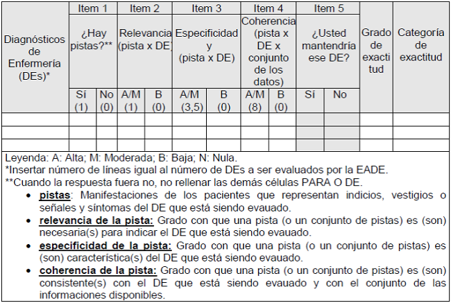 La EADE-2 fue creada para evaluar el grado con que una declaración diagnóstica es sostenida por el conjunto de datos clínicos del paciente 12. Para determinar el grado de exactitud diagnóstica por medio de la EADE-2, cada DE indicado por el enfermero debe ser evaluado individualmente con base en el conjunto de "pistas" contenido en los registros de la anamnesis y del examen físico del paciente 12.