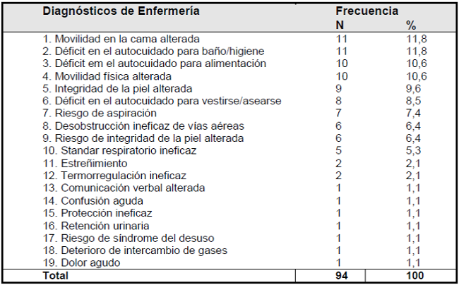 Como se observa en la Tabla 1, los DEs más frecuentes fueron: "movilidad en la cama alterada" (n = 11, 11,8%), "déficit en el autocuidado para baño / higiene" (n = 11, 11,8%), (n = 10, 10,6%) y "movilidad física perjudicada" (n = 10,6,%).