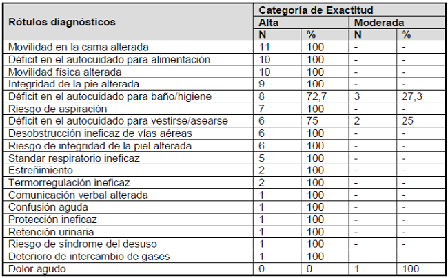 Como se observó en la Tabla 2, de las 19 (100%) etiquetas diagnósticas evaluadas, 16 (84,2%) fueron evaluadas como altamente precisas; 3 (15,8%) rótulos diagnósticos tuvieron frecuencia de respuesta en la categoría de exactitud moderada, siendo ellos: “déficit em el autocuidado para baño/higiene”, “déficit en el autocuidado para vestirse/asearse” y “dolor agudo”; no hubo frecuencia de respuesta en las categorías de baja exactitud y de exactitud nula (Tabla 3).