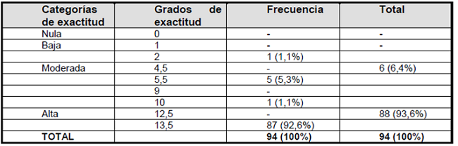 La Tabla 2 muestra el grado de exactitud de cada DE identificado en el estudio, con sus respectivas frecuencias.