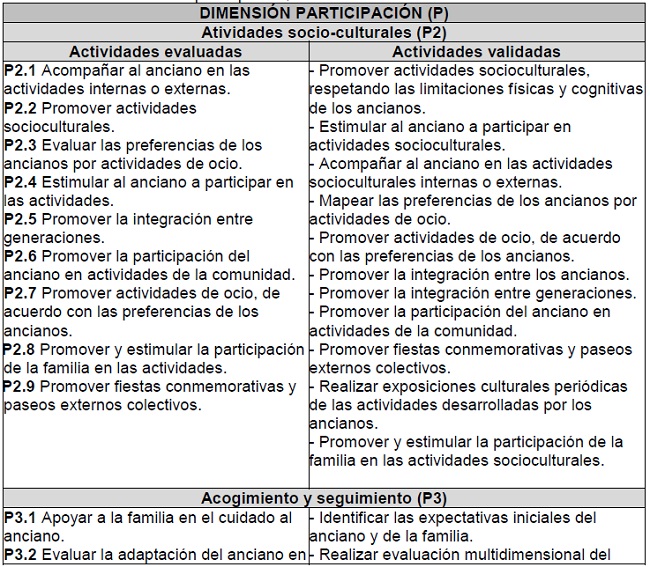 En la dimensión salud, para el 88% de los especialistas las descripciones contenidas en alimentación y nutrición y en higiene y confort representaban, en su conjunto, esas actividades. Para la dimensión participación, ese porcentaje fue del 100% para las actividades optimización de la capacidad mental y actividades socioculturales, y del 88% para las actividades de acogida y monitoreo y apoyo espiritual. En la dimensión seguridad/protección, el 88% de las jueces indicaron que las descripciones propuestas compusieron en su conjunto la actividad accesibilidad y movilidad y, en la dimensión aprendizaje a lo largo de la vida, ese porcentaje fue del 100% para las actividades socio-educativas.