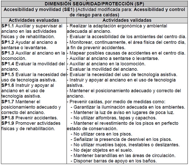 Results: Eight activities were validated and two included. In the health dimension, the activities were: functional capacity and frailty, food and nutrition, hygiene and comfort, drugs of continuous use, handling and cognitive stimulation; concerning participation: the socio-cultural activities, acceptance and monitoring, spiritual/religious support; concerning safety: accessibility and control of risk factors in falls; and concerning education: educational activities. Among 82 items assessed, 100% were considered relevant; 91,4% were considered clear; 97,5% were considered pertinent; and 92,6% were considered simple.