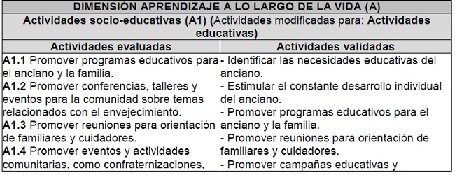 En la dimensión educación, las actividades educativas son una oportunidad de actualización y adquisición de nuevos conocimientos, que posibilitan el aprendizaje en relación a diferentes aspectos de la vida, como motivación para el cambio, sentido de competencia y mejora en la comunicación con otras personas, y contribuyen a la comprensión del proceso de envejecimiento28.