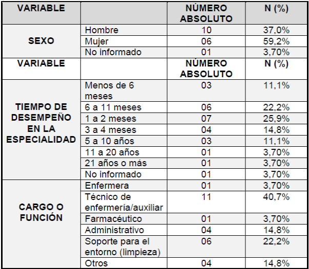 Se consideró sólo para análisis un total de 27 cuestionarios respondidos, representando el 55,7% del total de cuestionarios con posibilidad de evaluación; componiendo una muestra final: Enfermero (1), Auxiliares/técnicos de enfermería (11); farmacéutico (1) Administrativo (4), soporte ambiental/ servicio de higienización (6) Otros (4) referente a la categoría profesional no detallada en el cuestionario.