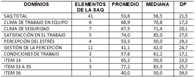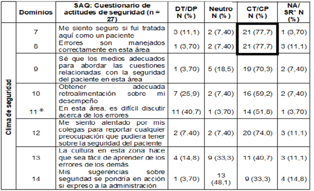 El dominio "Satisfacción en el trabajo" presentó el mejor puntaje, evaluado como la actitud más relevante por los participantes; presentando un resultado favorable a la cultura de seguridad. Este resultado presenta una relación directa con un menor número de eventos adversos 13.