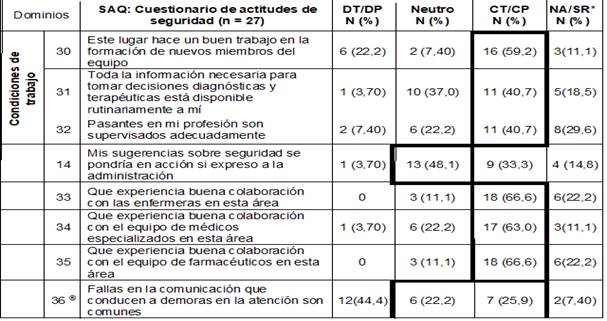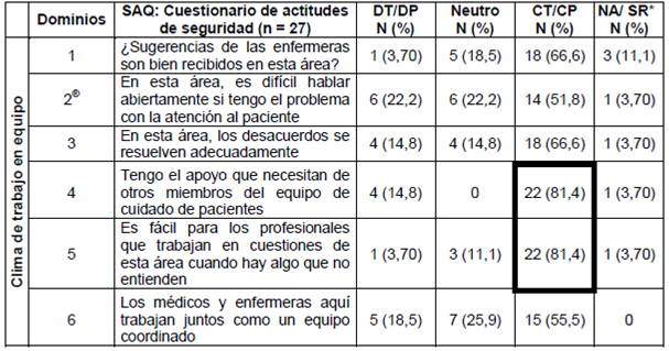 El hecho de que ambos dominios "Clima de trabajo en equipo" y “Clima de seguridad " presenten resultados casi similares puede ser explicado cuando percibimos cierta convergencia en algunas respuestas apuntadas en ambos.