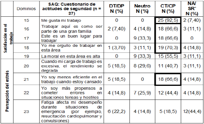 Se realizaron los análisis descriptivos por cuestiones de los dominios del SAQ, considerando las opciones de respuestas: en desacuerdo totalmente (DT) y en desacuerdo parcialmente (DP) y concuerdo parcialmente (CP) y concuerdo totalmente (CT) agrupadas para obtener mayor claridad en la estadística descriptiva.