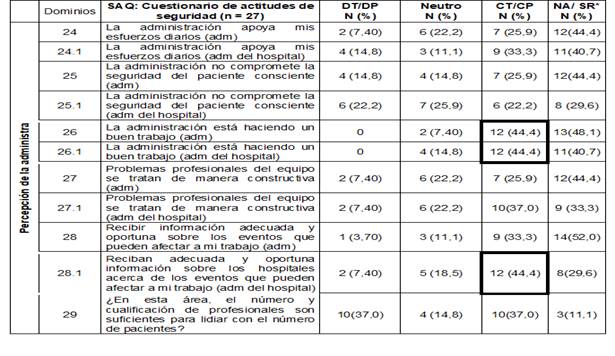 Corroborando con este análisis, un estudio realizado en un hospital privado de medio tamaño de un municipio de Minas Gerais, utilizando el SAQ como herramienta de medición del clima de seguridad, también evidenció la 'Percepción de la gerencia' con la peor media de 58, 90 puntos y evalúa un indicador de insatisfacción de los profesionales en cuanto a las acciones de la gerencia frente a las cuestiones de seguridad correlacionado este dominio a la aprobación de las acciones de la gerencia o administración, tanto de la unidad como del hospital como un todo 18.