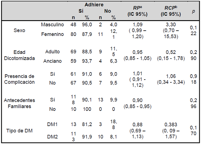 En el análisis bivariado de posibles factores que interfieren en la adhesión, hubo pequeña diferencia estadística para los sexos, siendo que el sexo masculino alcanzó mayor porcentaje de participantes adherentes. Sin embargo, no hubo diferencias estadísticamente significativas, cuando se consideraron los valores de p. Lo mismo ocurrió para el tipo de DM, en el cual los pacientes con DM2 presentaron mayor porcentaje de adherentes que los pacientes con DM1. Se consideraron estadísticamente significantes valores de p <0,05, con IC = 95%. La Tabla siguiente muestra los valores encontrados para el análisis bivariado (Tabla 1).