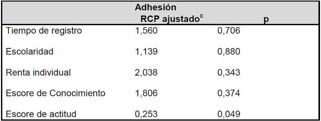 El análisis multivariado de los posibles factores que interfieren en la adhesión reveló que no hubo relación estadísticamente significativa entre las variables, exceptuando las actitudes de enfrentamiento a la DM, que presentaron p = 0,049. Observando el valor de RCP ajustado, se puede inferir que las actitudes positivas funcionan como factor de protección, ya que favorecen la adhesión al tratamiento medicamentoso, para un IC = 95%. La Tabla siguiente muestra los valores encontrados en la regresión logística para análisis multivariado (Tabla 2).