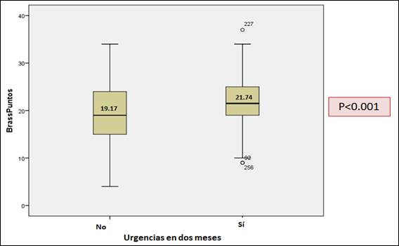 Del total de 301 pacientes dados de alta, acudieron a urgencias durante los dos primeros meses tras el alta 108 pacientes (35.8%). De los que el 9.3% (10), precisaron ser hospitalizados. La media del índice de BRASS-Sp en los pacientes que acudieron a urgencias fue de 21.74 (DE 5.23), mientras que en los que no acudieron fue de 19.17 (DE 6.05). La diferencia fue estadísticamente significativa (p<0.001) (Gráfico 1).