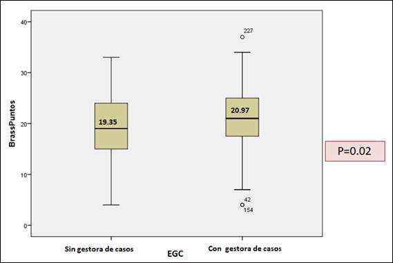 Los pacientes que, tras el alta continuaron en gestión de casos en Atención Primaria, obtuvieron una media del índice de BRASS_Sp de 20.97 (DE 6.11), mientras que en los demás la media fue de 19.35 (DE 5.60). La diferencia fue estadísticamente significativa (p=0.02) (Gráfico 3).