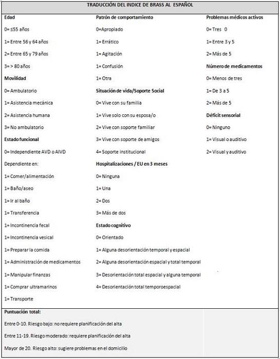 El índice Blaylock Risk Assessment Screening Score (BRASS), es una herramienta validada en diferentes países y en diferentes contextos como un buen instrumento predictor, para detectar pacientes que precisan ser institucionalizados al alta y que están en riesgo de estancias prolongadas 11)(12)(13)(14)(15. Anese también encontró que el índice de BRASS era un buen instrumento para la clasificación de pacientes hospitalizados en niveles de riesgo al alta hospitalaria 16).