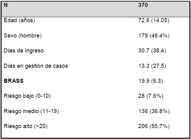 Resultados: La edad media fue 72.6 años (DE 14.05), 191 (51.6%) eran mujeres. Cuando analizamos la relación entre mortalidad e índice de BRASS-Sp en relación al sexo y número de días de ingreso encontramos una HR=1.73 (95% CI de 1.22 a 2.46) con una p=0.002 para sexo masculino y una HR=2.08 (95% CI 1.43 a 3.04) con una p<0.001 para puntuación del índice de BRASS_Sp. Los pacientes que continuaron en gestión de casos en Atención Primaria obtuvieron una media del BRASS-Sp de 20.97 (DE 6.11) mientras que en los demás fue de 19.35 (DE 5.60), p=0.02.