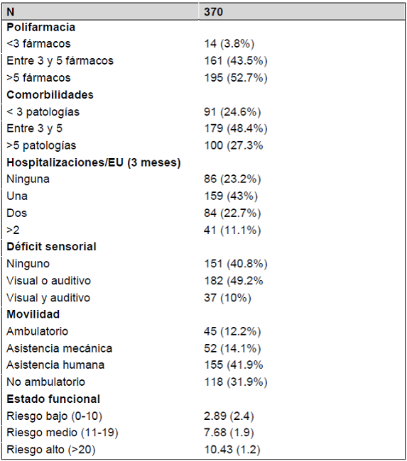 El 52.7% de los pacientes (195) tomaban más de 5 fármacos, el 48.4% (179) presentaban entre 3-5 patologías y el 43% (159) habían acudido a urgencias/hospitalización al menos una vez en los últimos tres meses. El 41.9% (155) necesitaba ayuda humana para la deambulación, el 49 % (182) presentaban algún déficit sensorial (visual o auditivo).