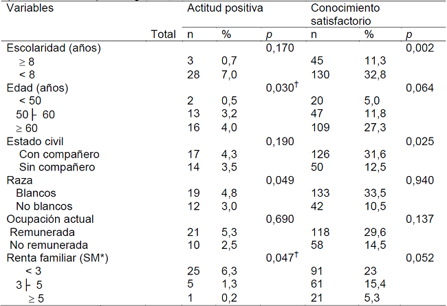 El análisis bivariado apuntó asociación significativa entre el conocimiento satisfactorio de la enfermedad con escolaridad> 8 años y el estado civil con compañero. La actitud positiva frente a la enfermedad, presentó asociación con la edad ≥60 años, color blanco y renta familiar <3 salarios mínimos (Tabla 1).