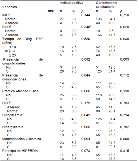 En cuanto a las variables clínicas y de laboratorio, se observa que la RCQ alterada (p = 0,002), el tiempo de diagnóstico entre 10 y 20 años (p = 0,030), presencia de comorbilidades (p = 0,003) y realización de monitoreo glucémico (p. <0,001) presentaron asociación significativa con el conocimiento satisfactorio de la enfermedad. Por su parte, la presencia de complicaciones autoreferidas (p = 0,044), ausencia de historial de hipoglucemia (p = 0,049) y de hiperglicemia en los últimos seis meses (p = 0,005) estuvieron asociadas con la actitud positiva frente a la enfermedad (Tabla 2) .