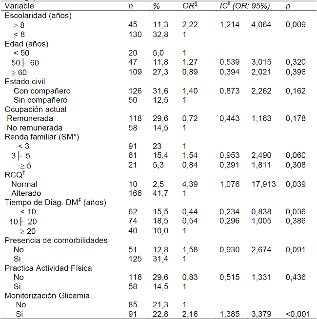 En el análisis multivariado, se observó que las variables escolaridad, RCQ, tiempo de diagnóstico de la enfermedad y monitoreo frecuente de la glucemia capilar presentaron asociación significativa con conocimiento satisfactorio sobre la DM (Tabla 3).