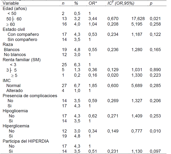 Los resultados de este estudio señalaron que tener ocho o más años de estudio, RCQ adecuada y realizar monitoreo frecuente de la glucemia capilar estuvieron asociados positivamente con conocimiento satisfactorio sobre la enfermedad, mientras que el tiempo de diagnóstico menor de 10 años estuvo asociado negativamente. Por su parte, actitud positiva frente a la enfermedad estuvo relacionada con edad entre 50 y 60 años y, de manera inversa, con eventos de hiperglucemia.