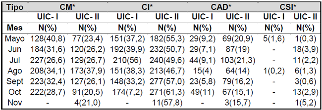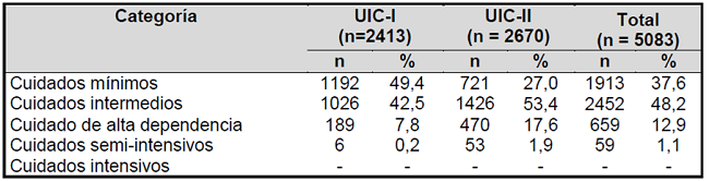 En relación a la clasificación del grado de dependencia, se obtuvo el predominio de paciente en cuidados mínimos (49,4%) en la UIC-I y en cuidados intermedios (53,4%) en la UIC-II. La clasificación completa del grado de dependencia de los pacientes en las unidades se presenta en la Tabla 1.