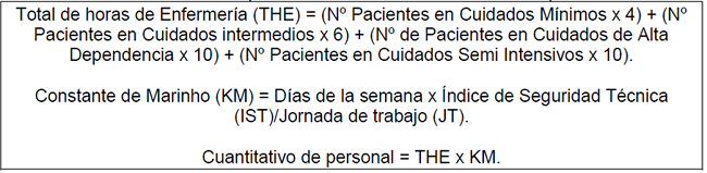 A partir de los datos relativos a la clasificación de los pacientes, se procedió al cálculo de personal de las dos unidades. Se utilizó la fórmula recomendada por el COFEn6, en que el tiempo de horas de enfermería es determinado, por medio de la clasificación de los pacientes, aplicación del índice de seguridad técnica y horas semanales trabajadas para la definición de la constante de Marinho.