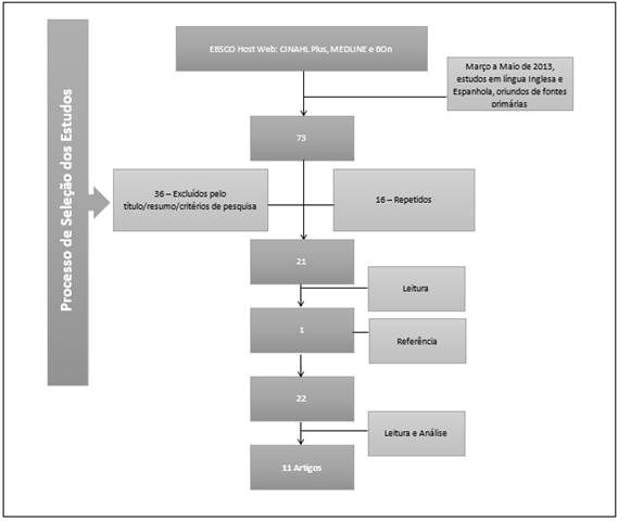 De la investigación bibliográfica inicial fueron identificados setenta y tres artículos, treinta y seis fueron excluidos por el título, resumen o por no ajustarse a los criterios de investigación esTablecidos y dieciséis estaban repetidos, habiendo sido seleccionados para posterior lectura veintiuno. Además de los veintiún artículos oriundos de la investigación inicial, también surge un artículo obtenido por referencia, obteniéndose veintidós en el conjunto final para análisis (Figura 1).