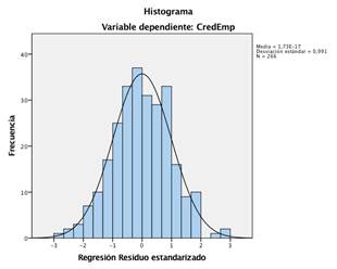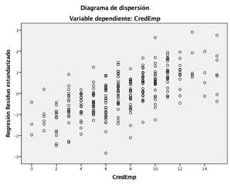 - Homocedasticidad: La varianza de los residuos es constante para cada una de las combinaciones de las variables independientes en relación a la dependiente. Se cumple observando que hay nube de puntos y no correlación entre los residuos tipificados y los valores pronosticados tipificados (figura 4).